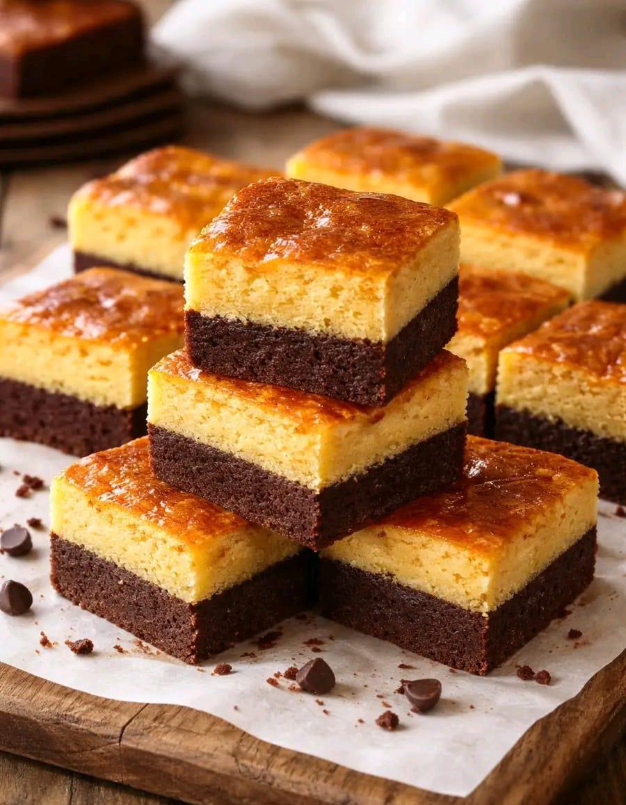 Brownie Butter Cake features a rich, fudgy chocolate base topped with a soft, buttery vanilla cake layer. The contrast of textures—dense brownie and fluffy cake—creates a dessert that is both comforting and luxurious.