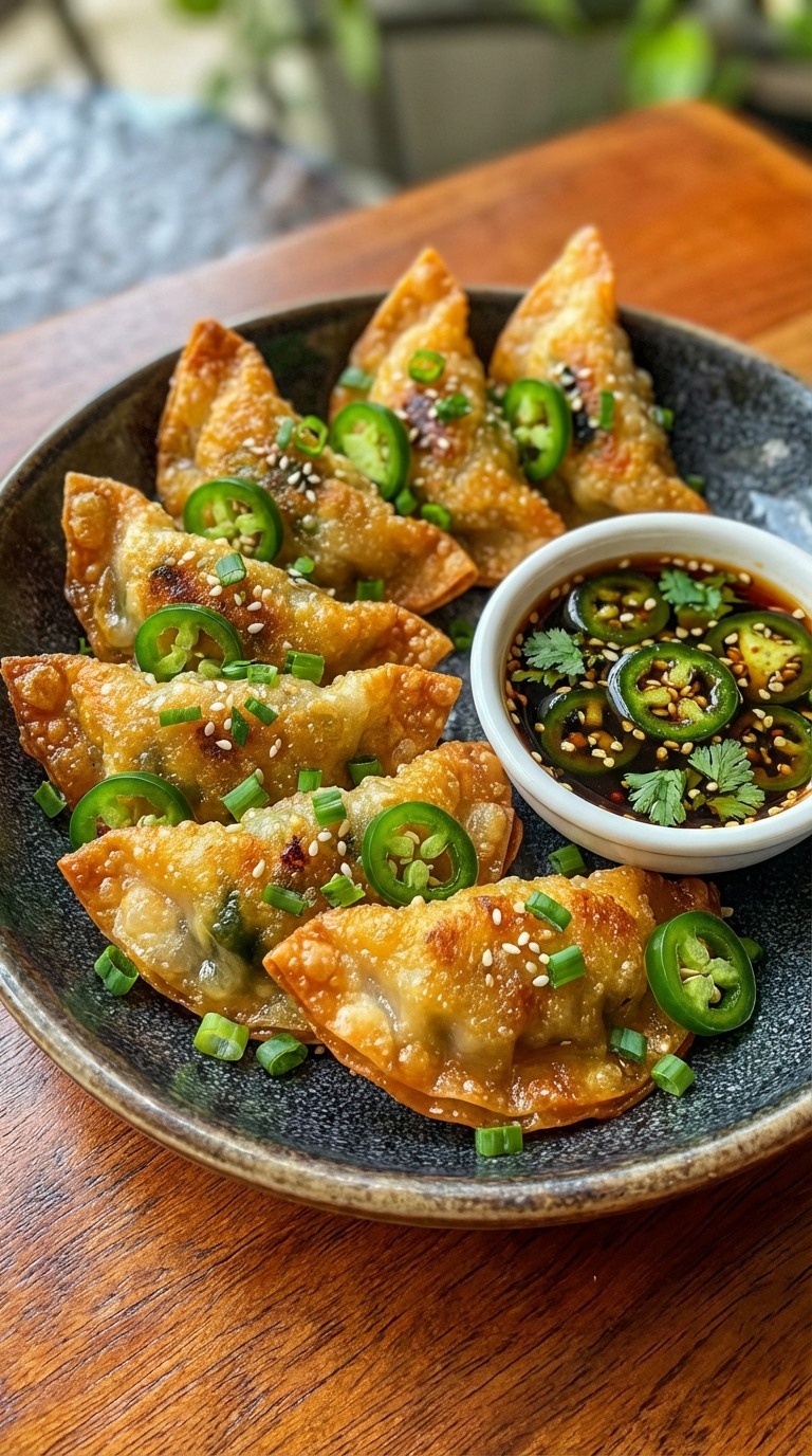 These wontons are crunchy on the outside with a creamy, mildly spicy filling inside. The jalapeño soy sauce adds a bold, savory kick that balances the richness of the cheese and peppers.