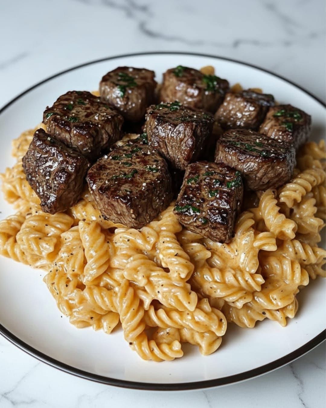 This dish features juicy, flavorful steak bites paired with tender pasta coated in a luxurious, garlic-Parmesan cream sauce. Every bite is rich, savory, and deeply satisfying.