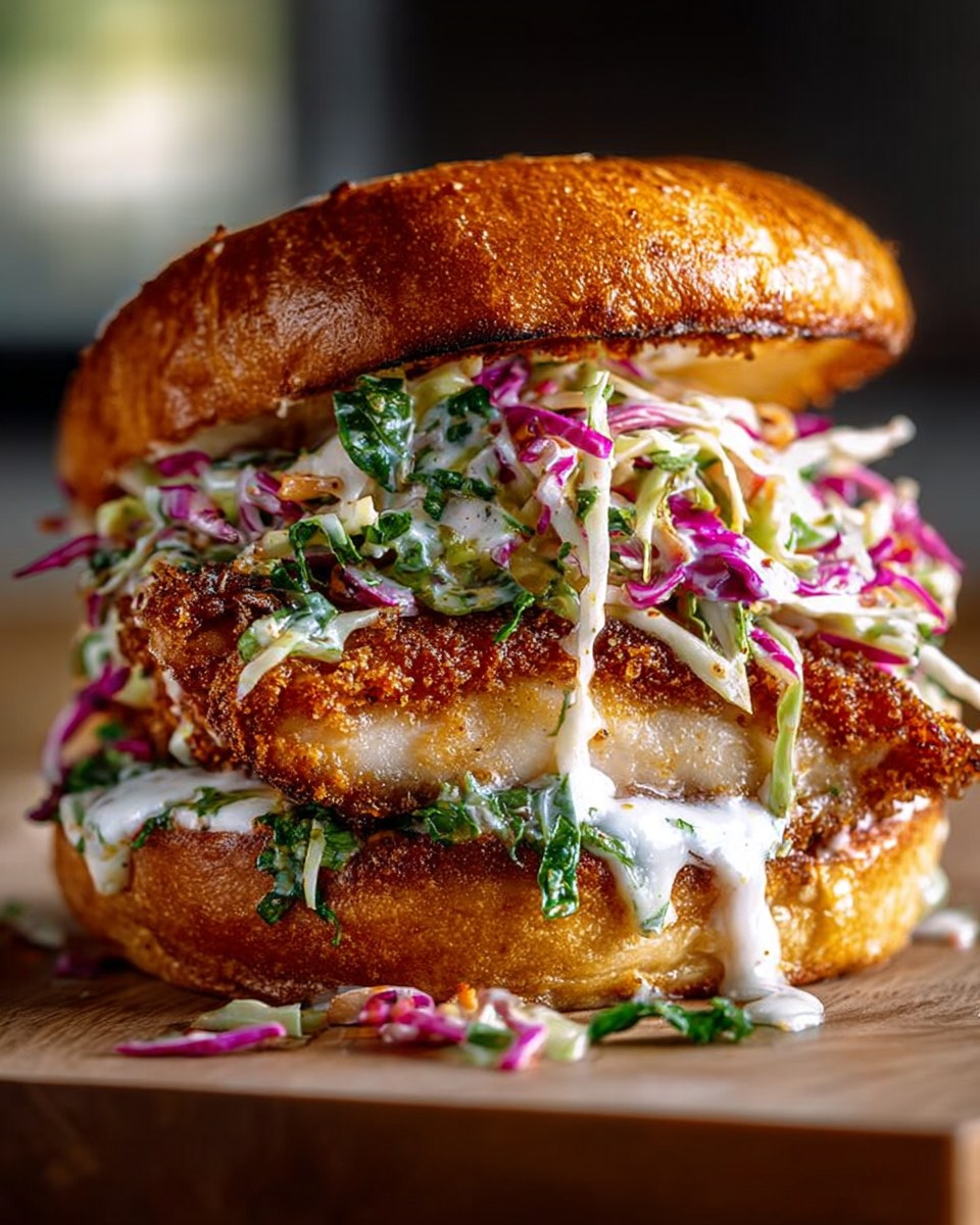 This sandwich is crispy, juicy, and cheesy, balanced by cool, tangy slaw that cuts through the richness. Every bite delivers crunch, melt, and freshness.