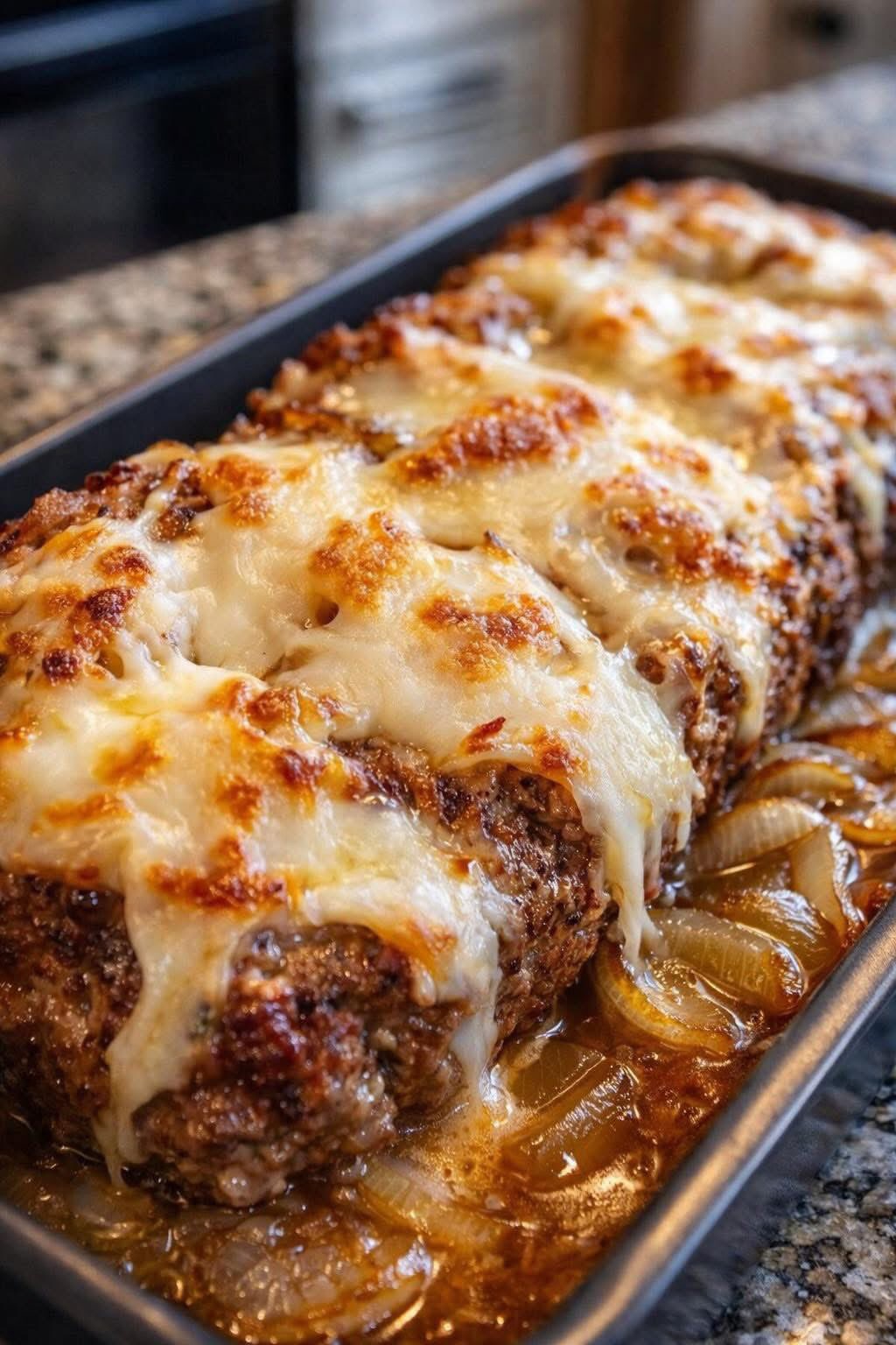 This meatloaf is juicy and deeply savory, with sweet onion flavor in every bite. The melted cheese topping adds richness and a comforting finish reminiscent of classic French onion soup.