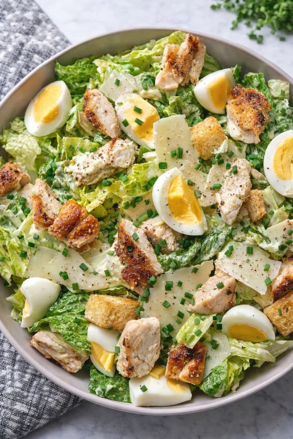 Caesar salad is one of the most internationally recognized salads, symbolizing simple ingredients elevated by bold flavor. Adding grilled chicken and eggs reflects modern health-conscious cooking, emphasizing balanced meals rich in protein and nutrients.