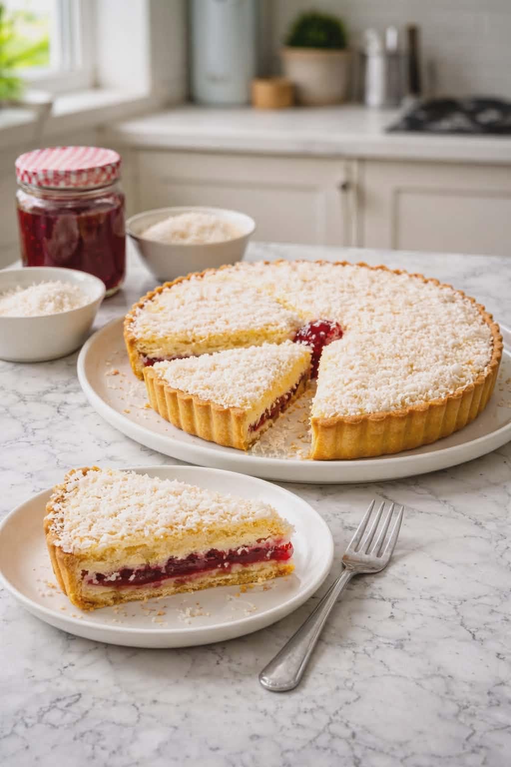 Manchester Tart is creamy, fruity, lightly sweet, and textured, with buttery pastry, smooth custard, tangy jam, and coconut crunch.
