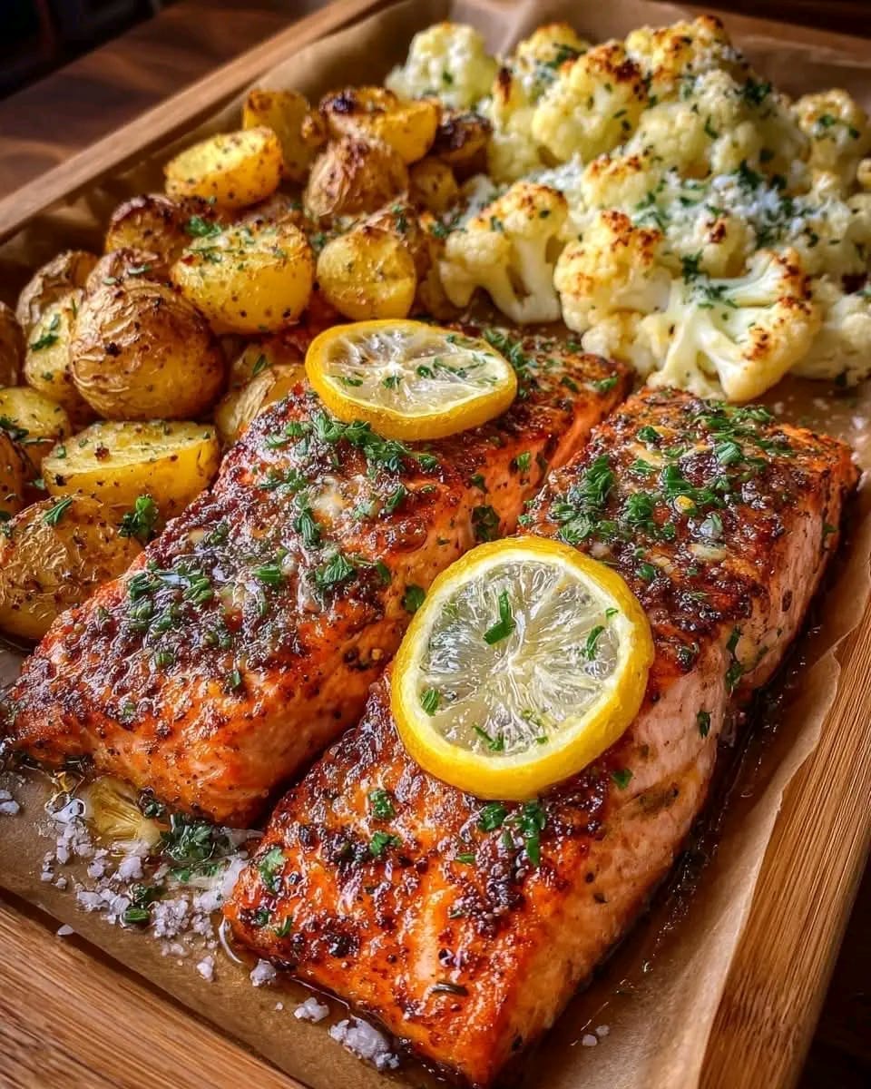 This dish pairs flaky, oven-roasted salmon with creamy cheesy cauliflower and crispy garlic-roasted potatoes. It strikes the perfect balance between wholesome nutrition and comforting indulgence—ideal for weeknight dinners or special occasions.